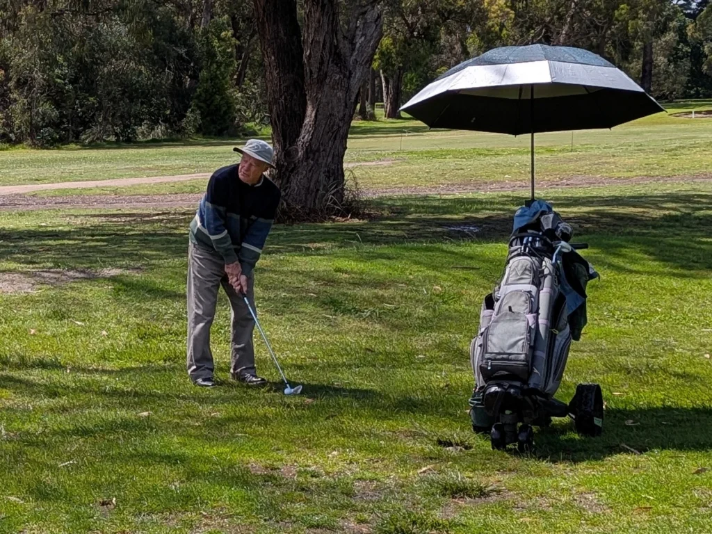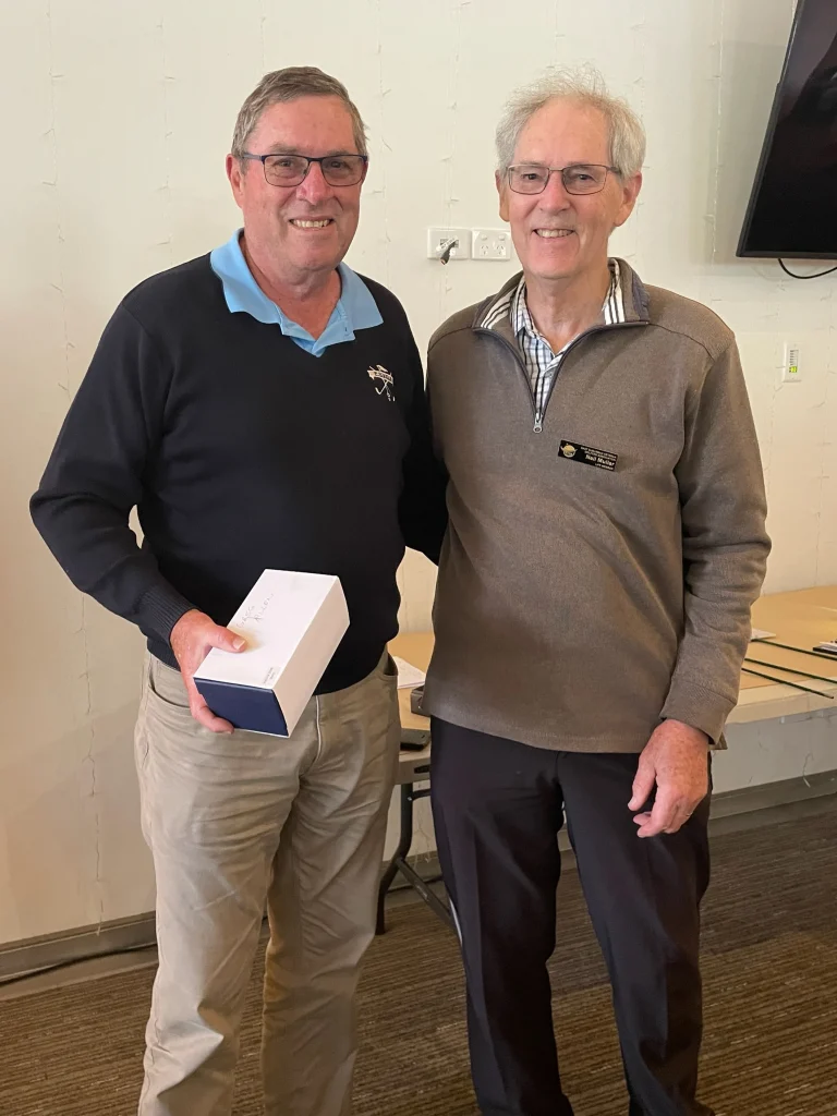 The course was presented in excellent condition with teeing grounds well grassed and soft enough for tees to insert. The greens were rolling true with very little bend. Unfortunately, the cup moved a lot as the ball approached. Touching the edge of the hole doesn’t count as the ball didn’t fall, just passed on by. The many trees made the course picturesque. They also waived the ball to a stop on a few occasions. A few even moved into the line of good shots causing deviation into the gumbo. Leaf litter in the rough made the wayward shot that little bit more difficult to find. The ball in litter against a tree stump was very hard to play. Ask Chris Lee and Peter Christianson about those issues. The NTP hole didn’t have many visitors to the green. Five names on the three markers. All around five meters out. None of the closest players made birdie. A boastful president was a centimetre short in B grade, then confidently plonked the bird.