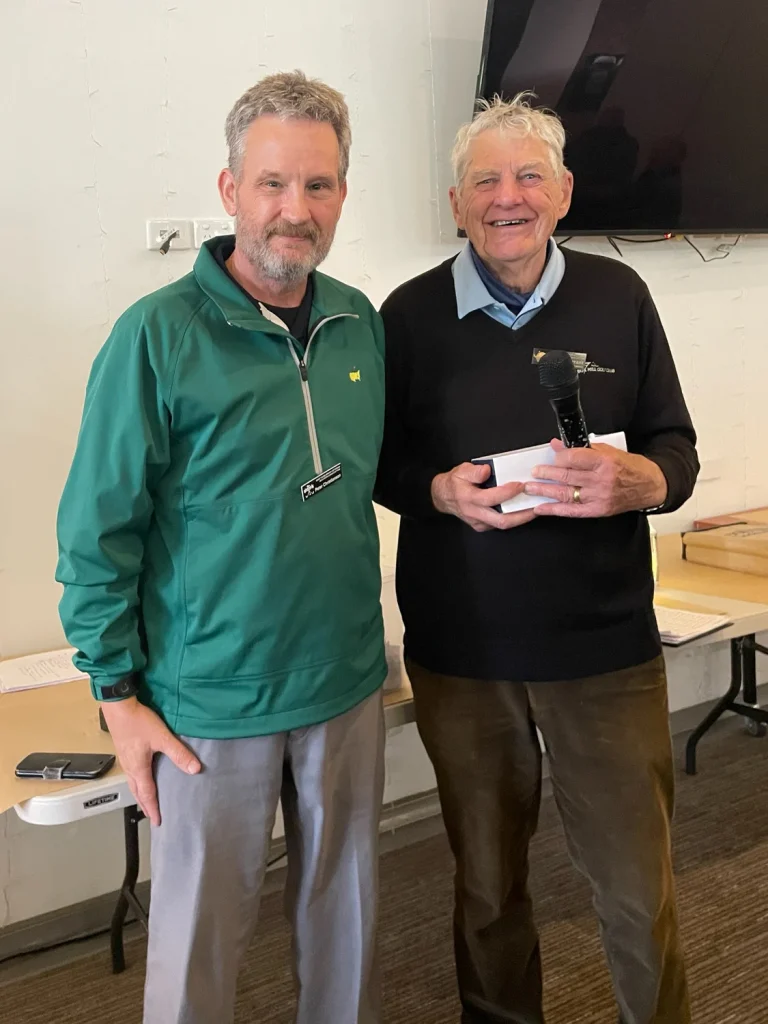 The ground was soft, and well struck shots did not get full value, pulling up 20 to 30 meters shorter than desired. The greens in many cases had a braking effect on the putts, regardless of borrow. Those easy 5 for 2 points often finished 6 for1. Dull clothing and grey skies did not provide good photography options. Only outside shots when the sun appeared made it to the website. Presentation time was another story (later). Highlights were few if any. A notable steady approach by Colin Looker who putted with aplomb kept his team within reach of the winner’s circle. Henry Chen, Colin’s partner, couldn’t’ match him on the putting surface. They finished three points behind the winners, on 39.