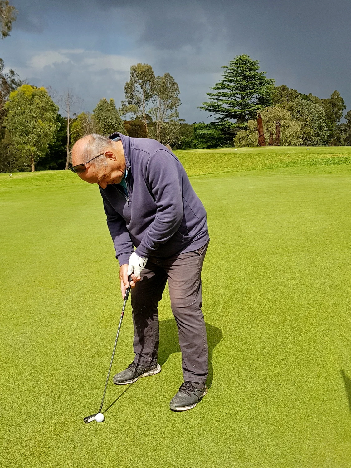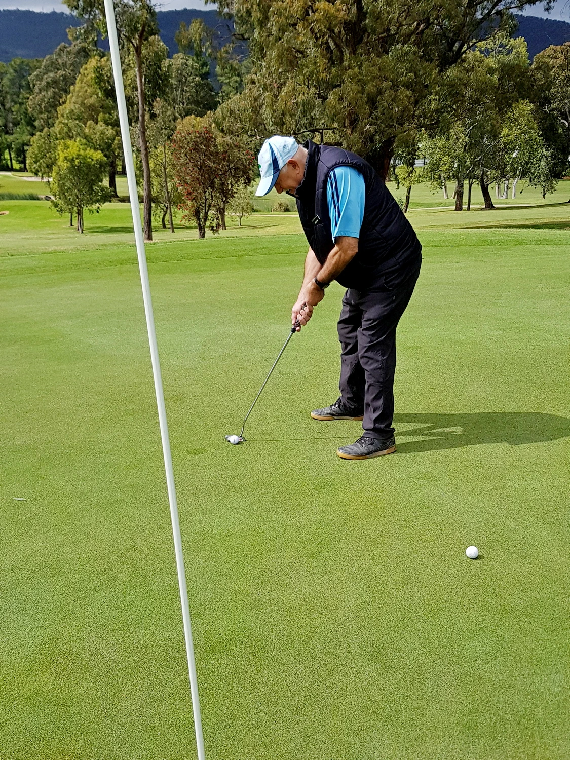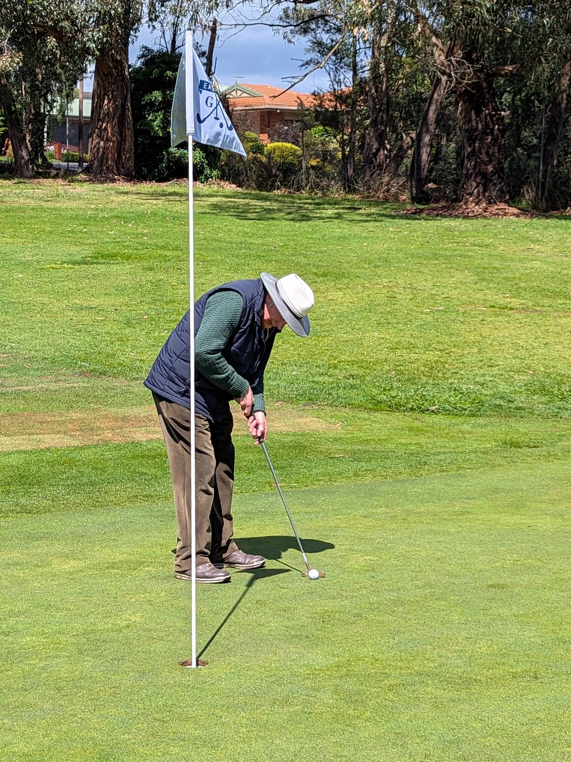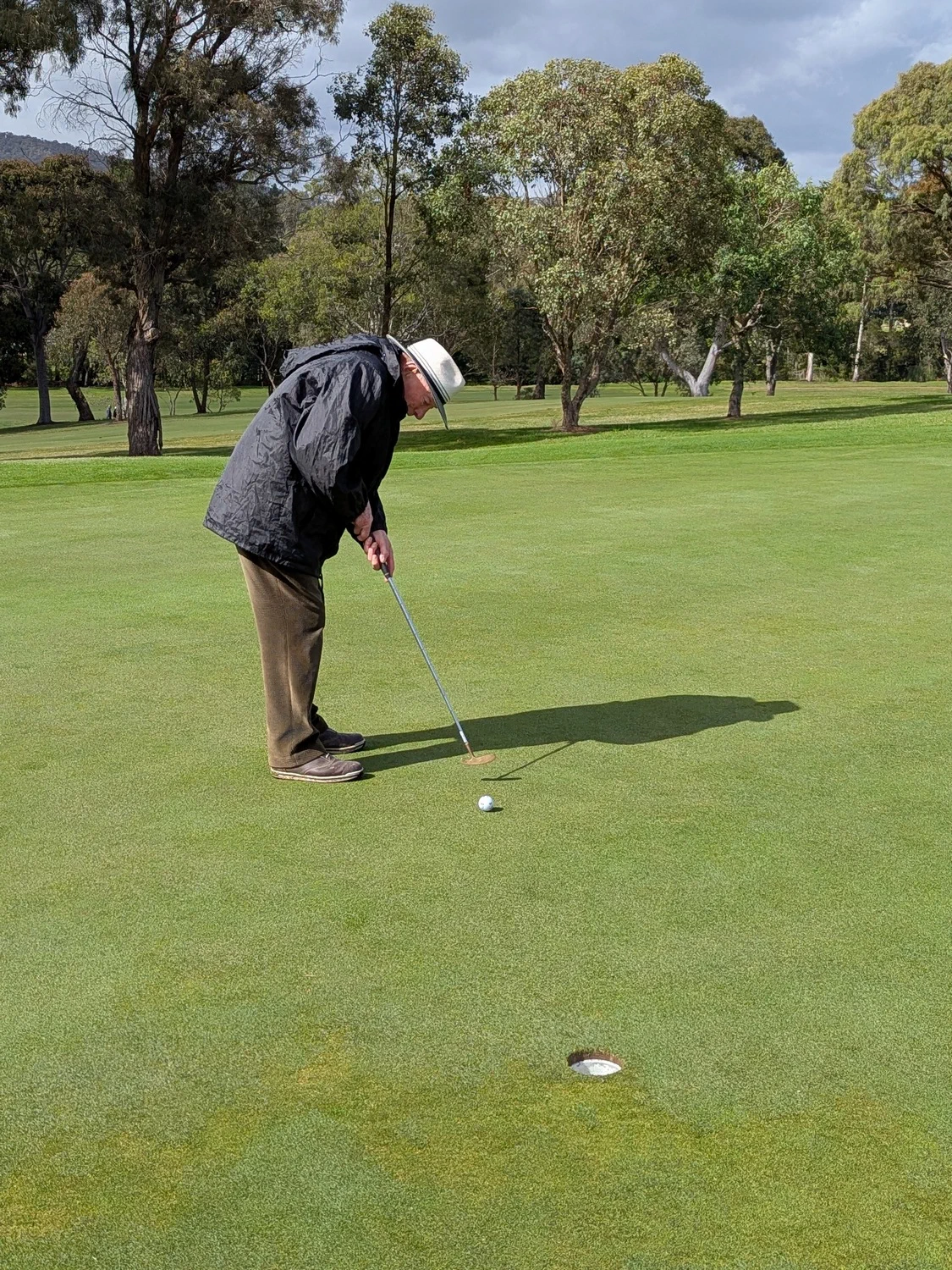 The course was presented in excellent condition with teeing grounds well grassed and soft enough for tees to insert. The greens were rolling true with very little bend. Unfortunately, the cup moved a lot as the ball approached. Touching the edge of the hole doesn’t count as the ball didn’t fall, just passed on by. The many trees made the course picturesque. They also waived the ball to a stop on a few occasions. A few even moved into the line of good shots causing deviation into the gumbo. Leaf litter in the rough made the wayward shot that little bit more difficult to find. The ball in litter against a tree stump was very hard to play. Ask Chris Lee and Peter Christianson about those issues. The NTP hole didn’t have many visitors to the green. Five names on the three markers. All around five meters out. None of the closest players made birdie. A boastful president was a centimetre short in B grade, then confidently plonked the bird.