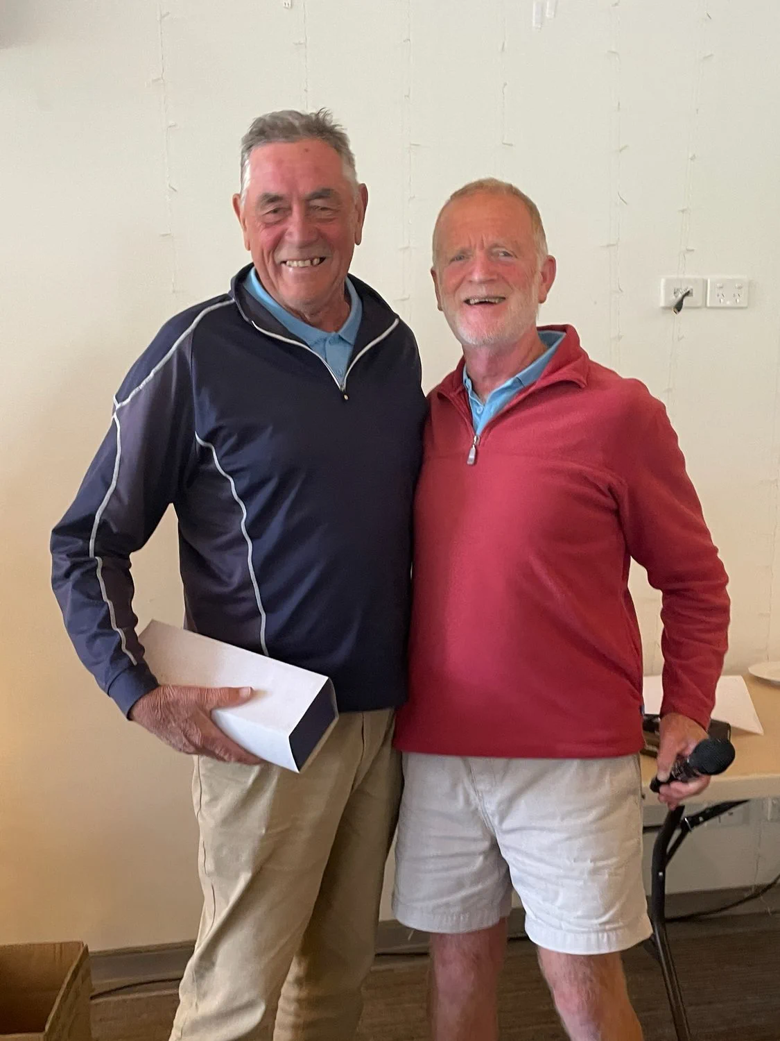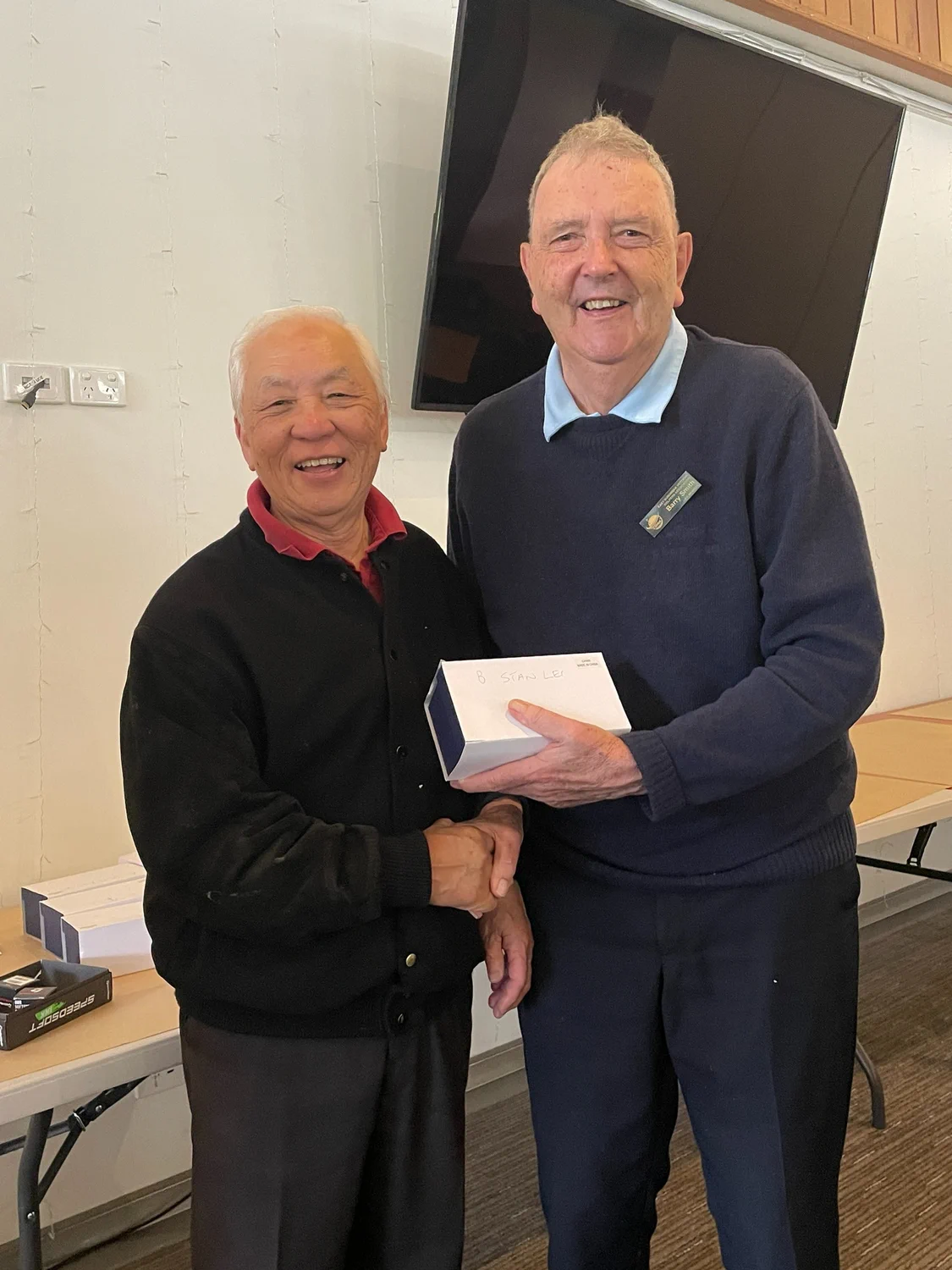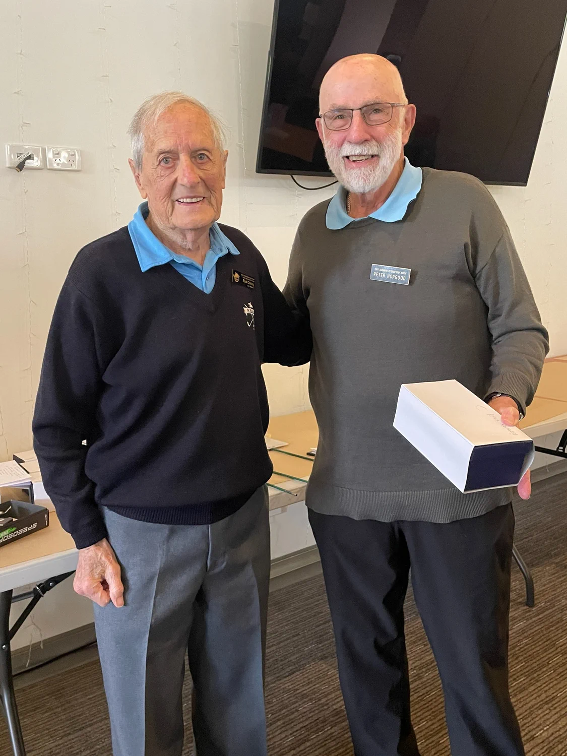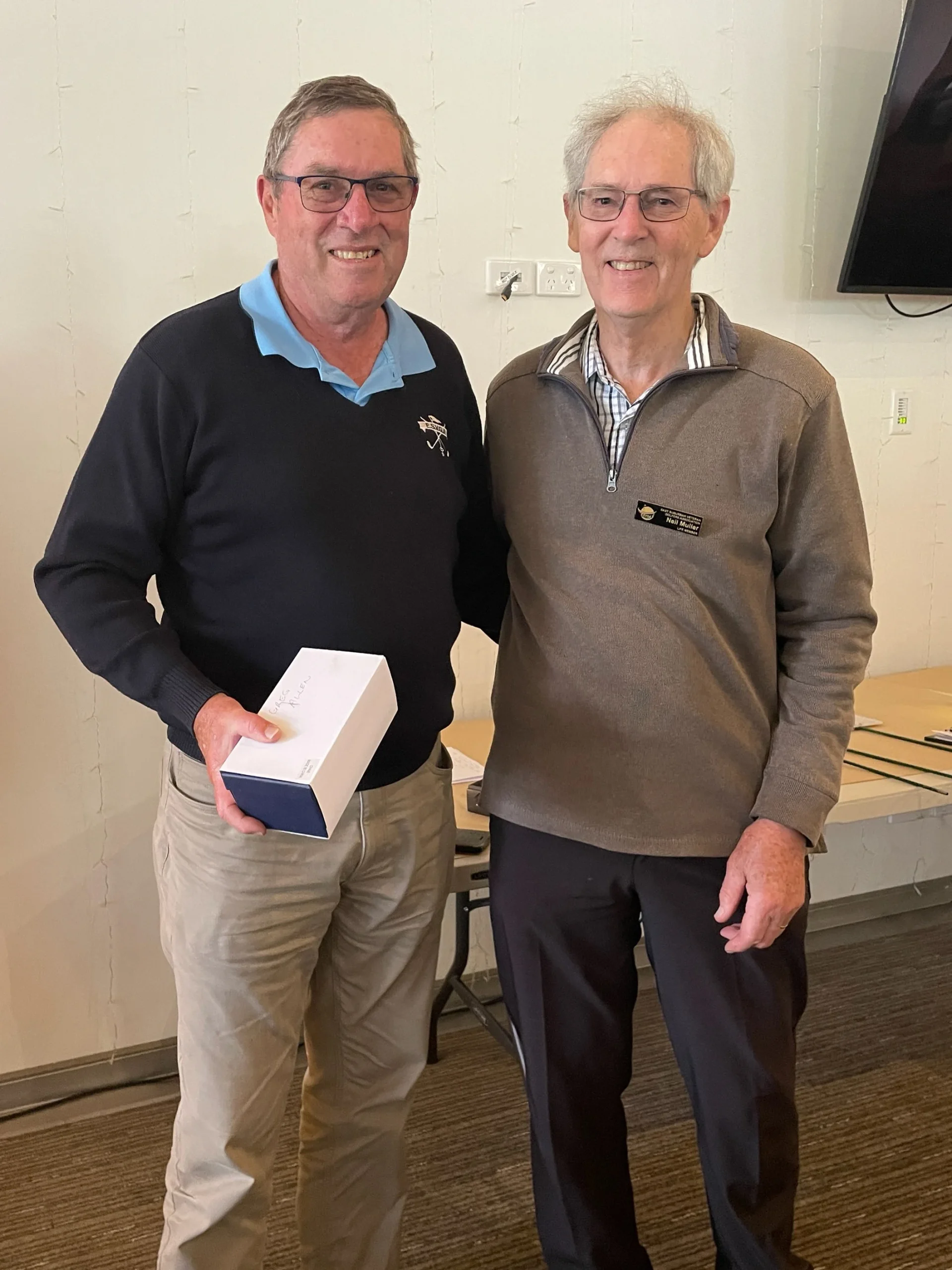 Everyone had their Christmas drink and sandwiches by one pm. Announcements were delayed by hiccups in the score registration. Sam, Norm and later Bruce and Ken working with the assistant pro eventually had the day’s results. A triple dead heat. 42 points only. Geoff Johnson/Peter Mastertoun, Horst Eberius/David Finn, Noel Blythe/Greg Allen were the lucky pairs. Derek Wilson and Ken Batrouney took out the fourth place on count back with 41. A full list of results has been sent to members, and the winners list is on the website. Several times this year no C grade NTP has been won. It happened again at Eastwood. The prize goes back in the bank. Now for the raffle. This is not comprehensive, look to the web for the rest. “Wushka”, sporting his separately sourced 4XXX blue polo with ESVGA logo (see attached photo above), had his ticket drawn to win a prize. He was asked to do the next draw and promptly pulled his other ticket to win again. What a day for “Wushka”.