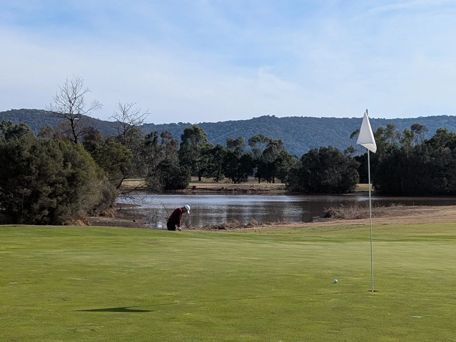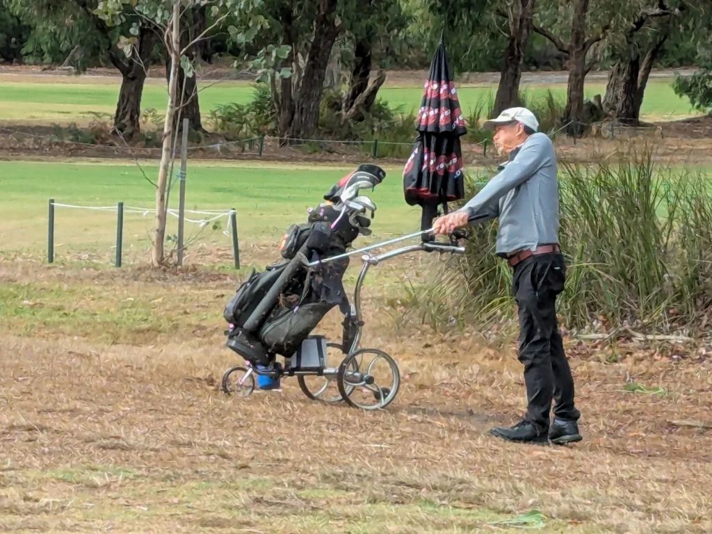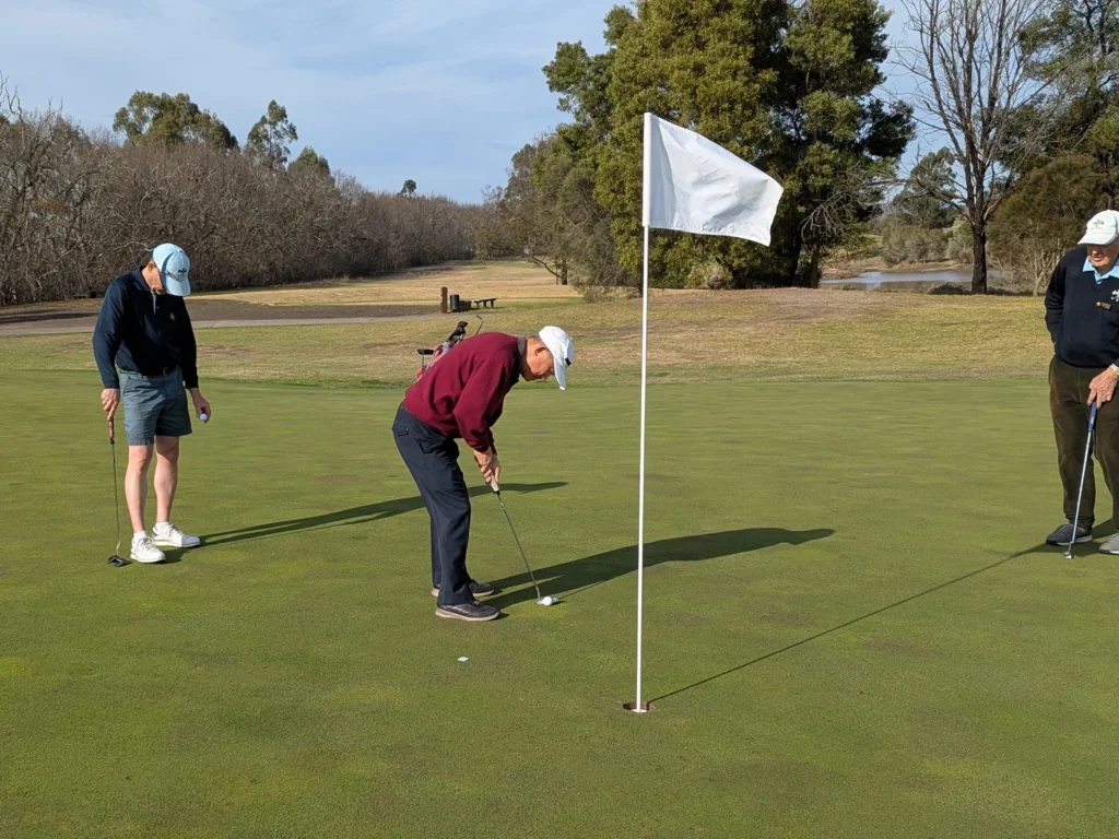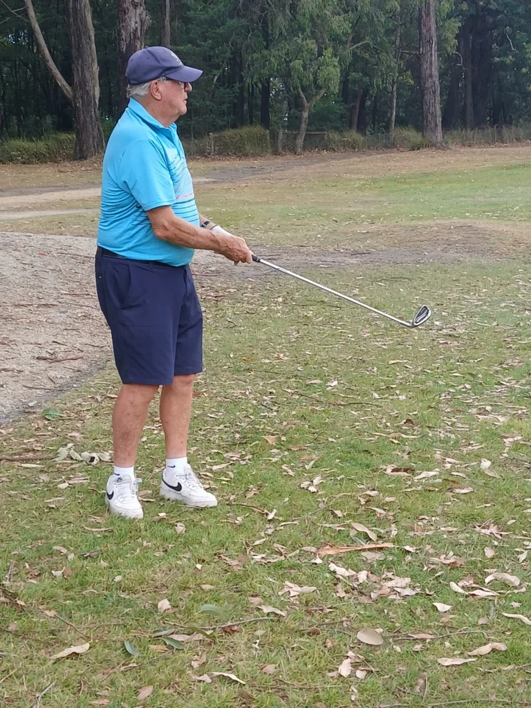 The course was presented in excellent condition with teeing grounds well grassed and soft enough for tees to insert. The greens were rolling true with very little bend. Unfortunately, the cup moved a lot as the ball approached. Touching the edge of the hole doesn’t count as the ball didn’t fall, just passed on by. The many trees made the course picturesque. They also waived the ball to a stop on a few occasions. A few even moved into the line of good shots causing deviation into the gumbo. Leaf litter in the rough made the wayward shot that little bit more difficult to find. The ball in litter against a tree stump was very hard to play. Ask Chris Lee and Peter Christianson about those issues. The NTP hole didn’t have many visitors to the green. Five names on the three markers. All around five meters out. None of the closest players made birdie. A boastful president was a centimetre short in B grade, then confidently plonked the bird.