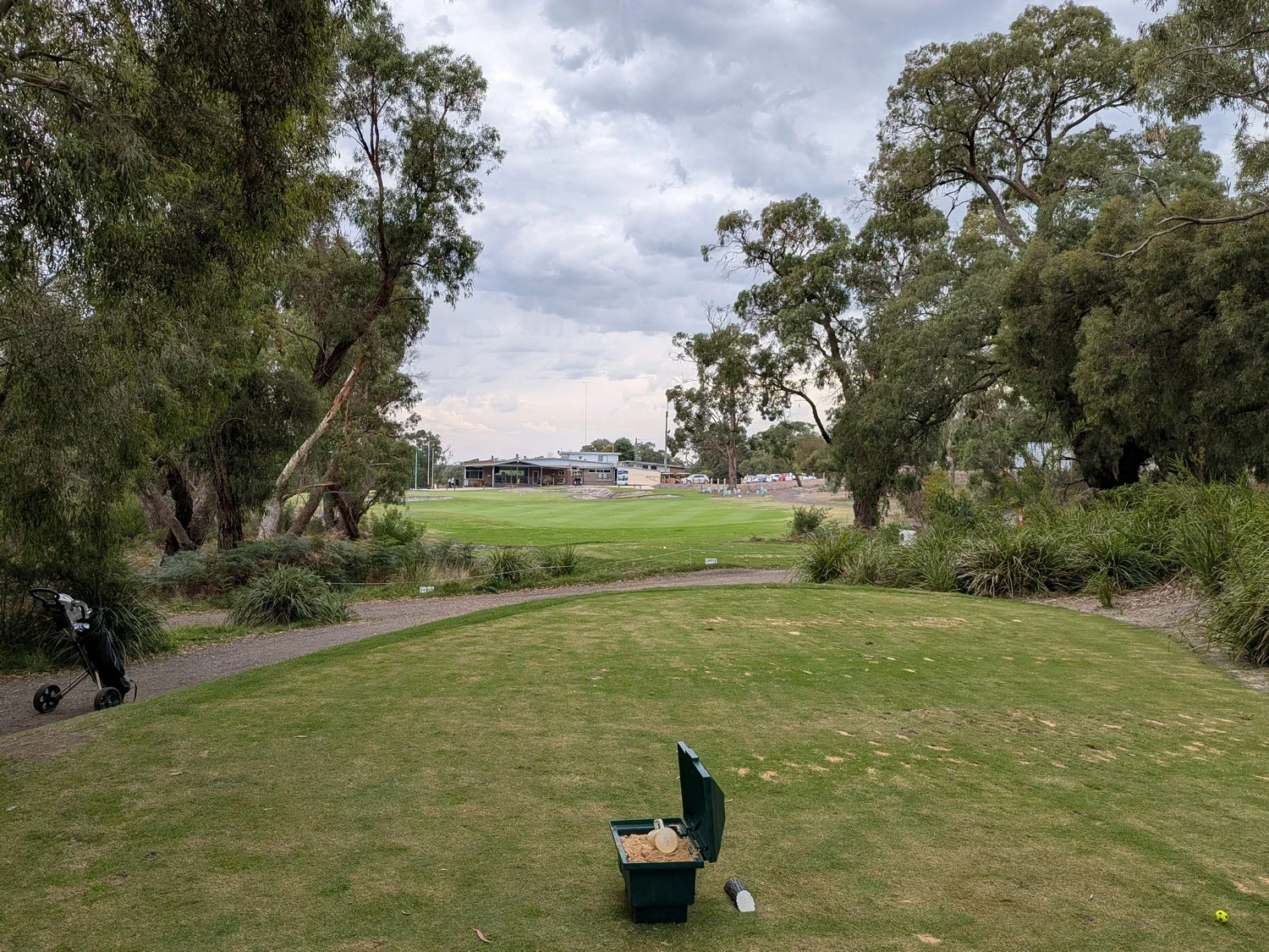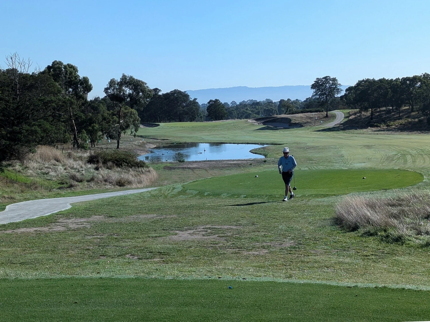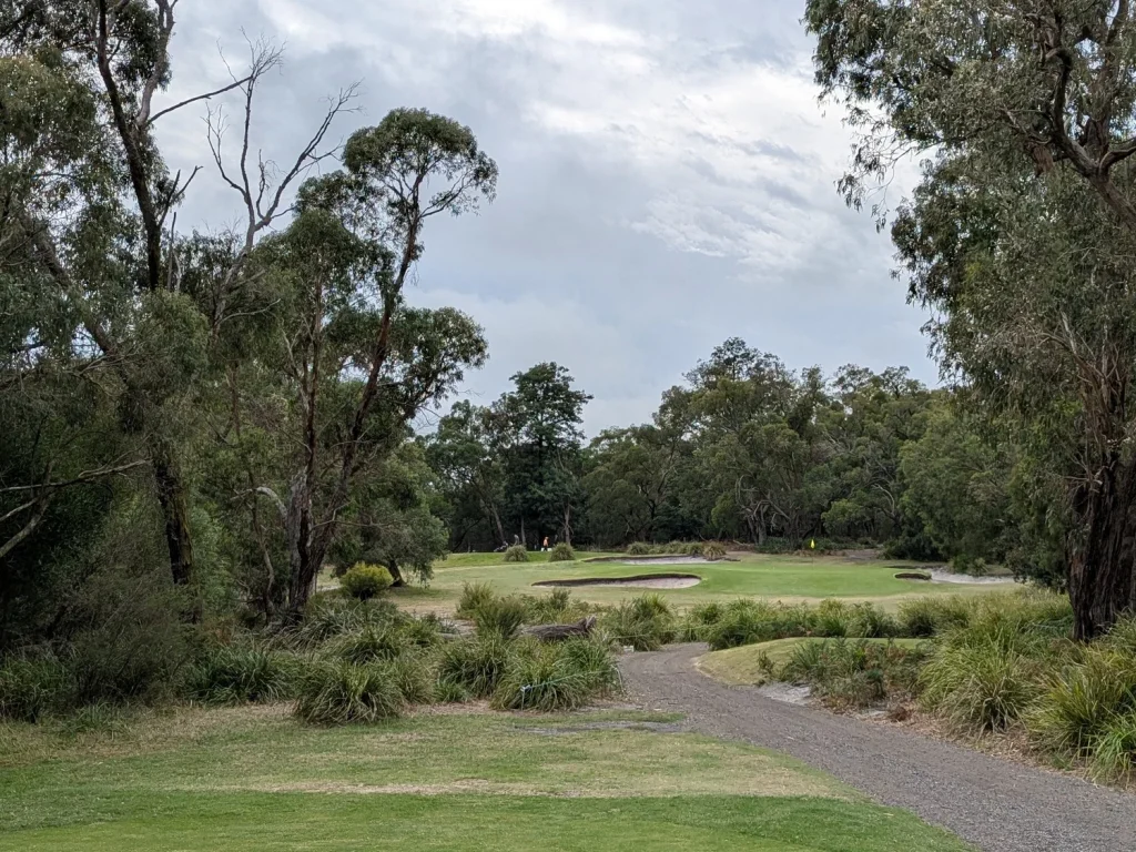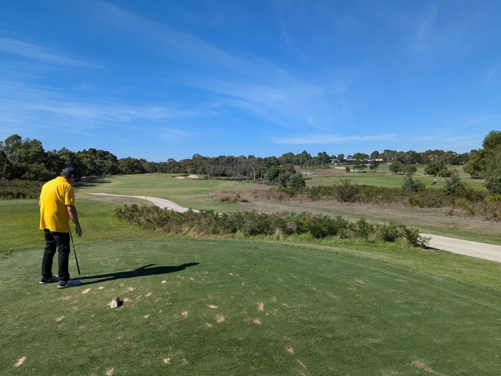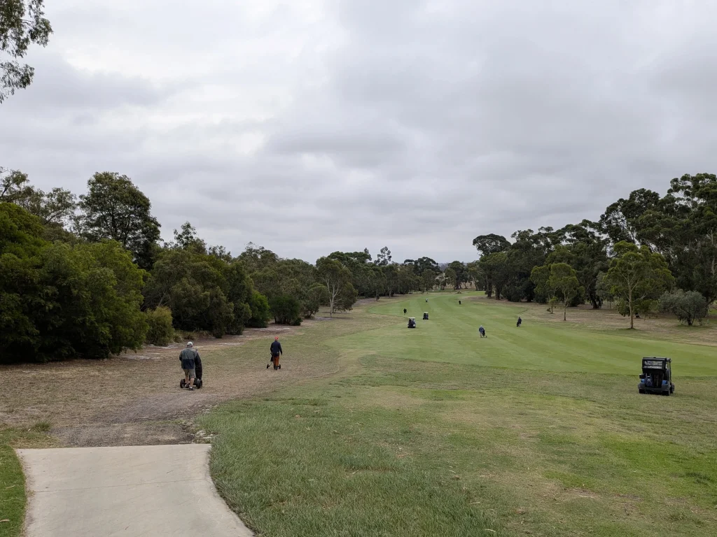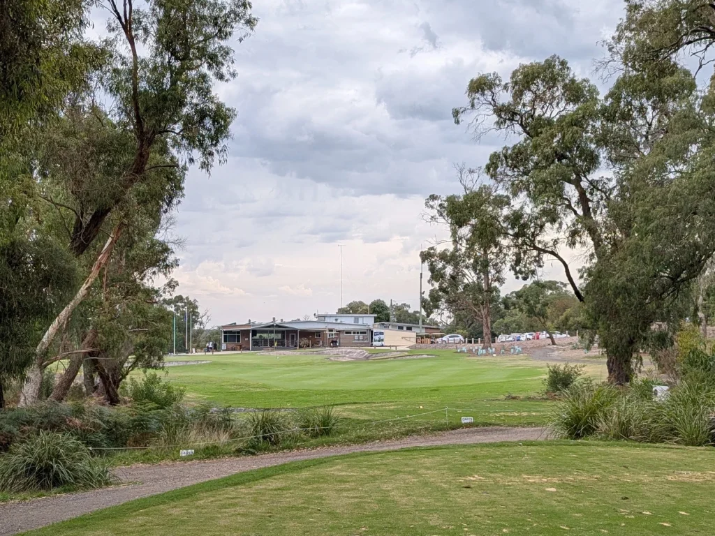 This was our second game at Glen Waverley. Last year hot and sweaty, this year overcast, slight misty drizzle, still sweaty due to the high humidity. It seems to be a good venue. Central location, well grassed and greens running true. Depending on putting styles the greens could be fast or slow. Today they were slower due to the wet days preceding. Tentative or timid putters paid with three or four putt greens.